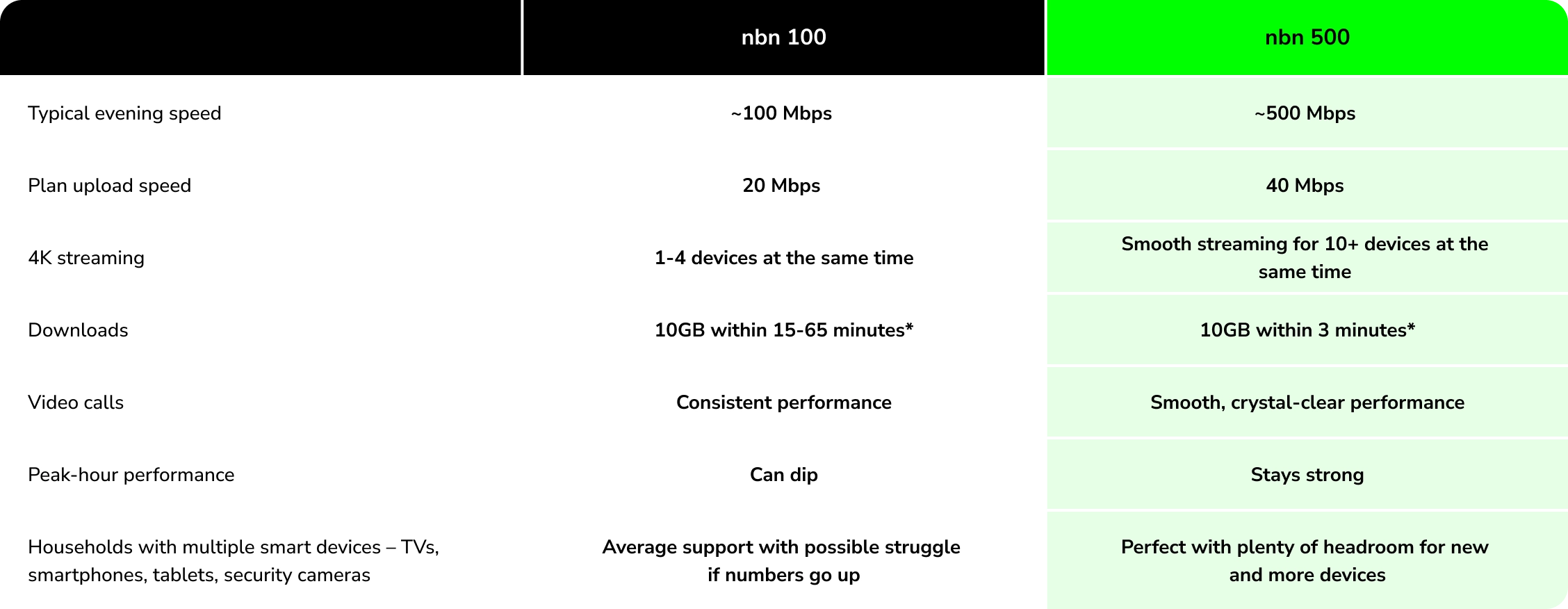 It’s a strong step up from entry-level plans. And if you’re rocking with a FTTC or FTTN connection type, the 100 Mbps plan may be the fastest plan you’re eligible for. That’s why, historically, it was a solid choice. For those on an FTTP or HFC connection types, the nbn 100/20 plan has been automatically upgraded to 500 Mbps by the nbn since September 2025. That means with the right provider, you can have 5x the speed for a great price!