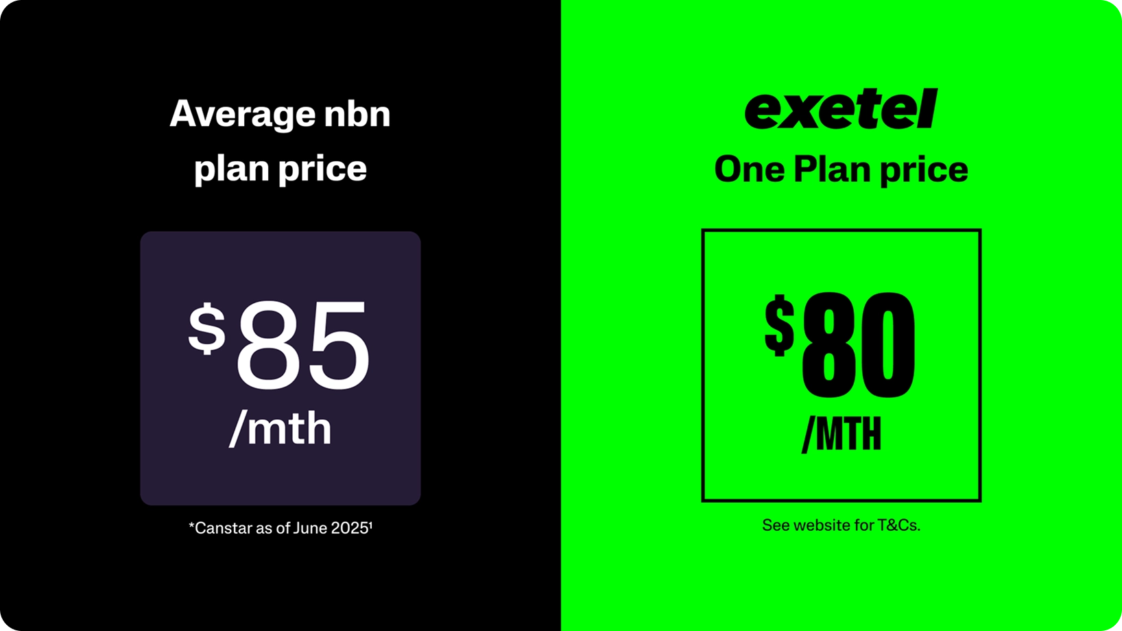 According to Canstar’s research1, Aussies are forking out around $85 a month for internet on average. Meanwhile, Exetel’s One plan is serving up nbn 500 speeds (TES: 500/40 Mbps) for $80 a month ongoing — no “surprise, promo’s over” plot twist a few months in. Faster than what most people are on, cheaper than the national average and none of that gotcha energy? The decision basically makes itself. Easy. The One.