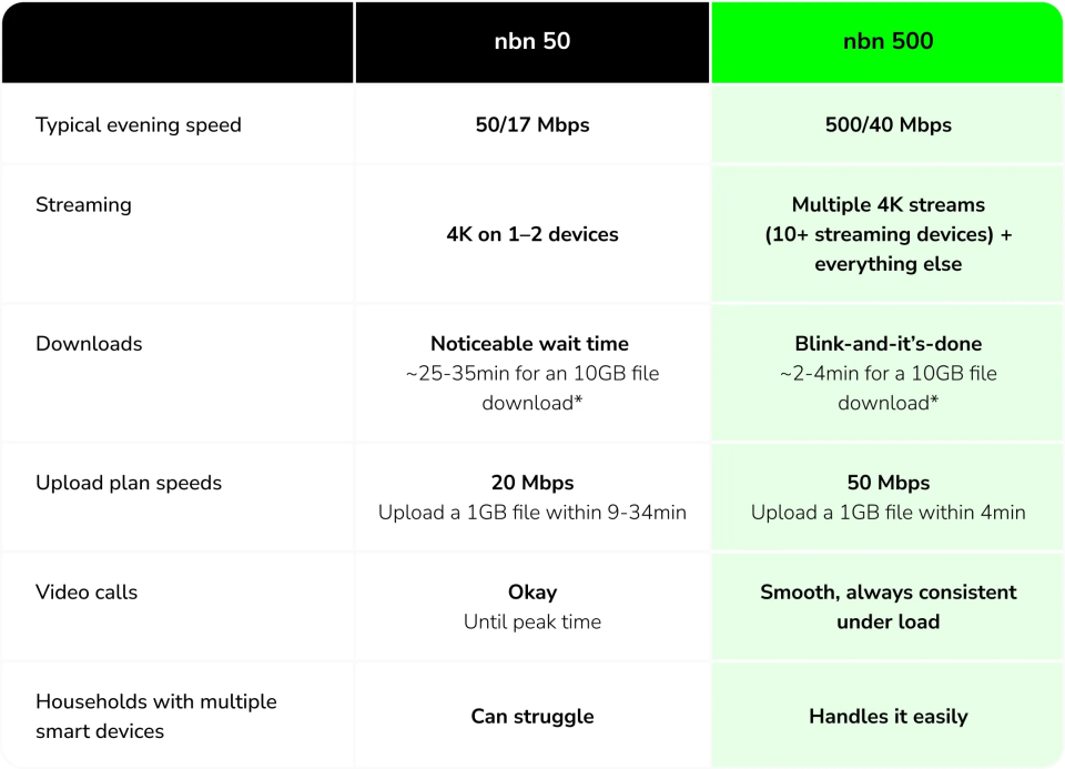 The long answer? nbn 500 gives you far more capacity by up to 10x the speed of an nbn 50 plan, so the internet doesn’t fall apart when real life overlaps.