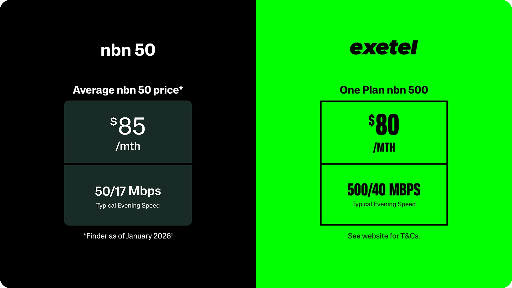 So, if you’re considering an upgrade and have read the above thinking, “Yeah, that sounds like me,” don’t fall into the promo-price trap. Exetel’s One Plan nbn 500 (TES: 500/40 Mbps) is $80 per month, ongoing. One plan. One price.